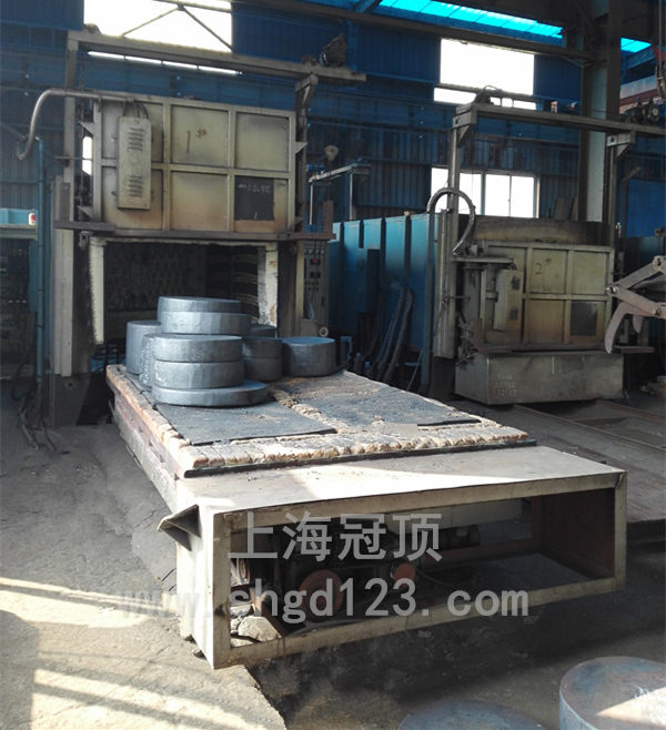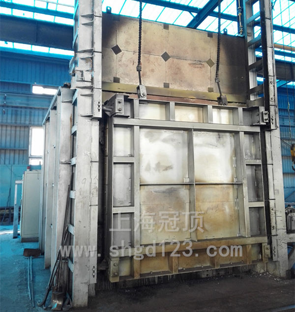 臺車采用重載結(jié)構(gòu),密封槽為自動提升式沙封機(jī)構(gòu)減少臺車爐的熱損失,臺車由大功率動力系統(tǒng)帶動。臺車上安裝有鉻錳氮耐熱鋼爐底板或1200℃碳化硅爐底板承載工件。